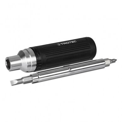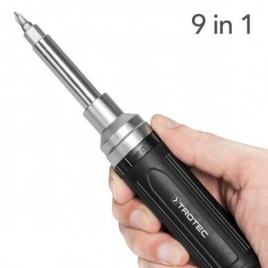 Tvirtas, aukštos kokybės ergonomiškas atsuktuvas Trotec „9 IN 1“ tiks įvairiems buities darbams. Kad atsuktuvas tarnautų ilgai ir pateisintų lūkesčius, plokščio atsuktuvo antgalius (4 mm, 5 mm, 6 mm) reiktų naudoti lengvesniems montavimo, surinkimo, medienos apdirbimo ar restauravimo darbams. Kryžminio atsuktuvo antgalius (PH0, PH1, PH2) galima naudoti remontuojant dviračius, motociklus, elektroninius prietaisus. Šešiakampės atsuktuvo galvutės (1/4", 5/16", 3/8") puikiai pasitarnaus dirbant su universaliais medienai arba metalui tinkančiais varžtais.