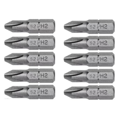 • PH2 SCREWDRIVER BITS / 10pcs.Phillips PH2 screwdriver bits engineered for use in corded and cordless drills.Characteristics•    durable, made of high quality S2 alloy steel•    resistant to deformation•    drop-forged•    hardness: 58-60 HRC•    recommended for high frequency and heavy duty applications•    manufactured in accordance with DIN 3126•    1/4” hex profile