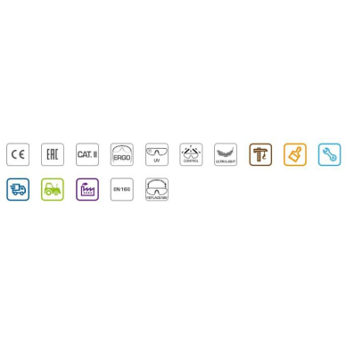 • medžiaga: polikarbonatas – lęšis ir rėmelis / TPR išilginės kojos / PVC tiltelis; . papildomas elastinis dirželis – nuimamas; . papildomas vidinis nailono rėmas; . elastinga, nuimama, reguliuojama juosta; . optinė klasė: 1 (+ 0,06 dioptrijos – skirta nuolatiniam dėvėjimui); . mechaninis atsparumas: F (mažas smūgis Energija 45 m/s); . filtro tipas: 2C; .  EN 166:2001; . įbrėžimams ir rasojimui atsparūs lęšiai; . akiniai be rėmelių; . juodos spalvos su žaliais akcentais.