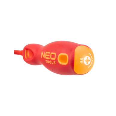 • NEO 1000 V cross screwdriver. Certified for use on live parts up to 1000 V. Screwdriver shank is made of exceptionally durable S2 steel. Screwdriver blades are heat-treated to obtain suitable resistance to bending and hardness. Screwdriver has magnetic tip. Tri-lobular handle shape with profiled thumb rest reduces hand effort during work and facilitates getting the right torque. Two material handle prevents from slipping in hand, it is also resistant to chemicals, oils and greases. Tool quality confirmed with TÜV certificate and 25 years manufacturer's warranty. NEO brand meets expectations of professionals.