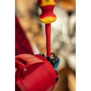 • NEO 1000 V slotted screwdriver. Certified for use on live parts up to 1000 V. Screwdriver shank is made of durable S2 steel. Screwdriver has magnetic tip. Ergonomic handle shape with dedicated thumb rest reduces hand fatigue when working. Two material handle prevents from slipping in hand, it is also resistant to chemicals, oils and greases. Product reliability is confirmed with 25 years warranty. NEO brand meets expectations of professionals.