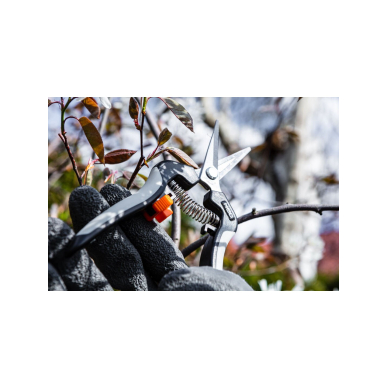 • Young shoot pruner 185 mm, range up to 6 mm 15-207 by NEO is a one-handed tool for use at home or in the garden, suitable for delicate, smaller plants that require special precision. The item is equipped with a pair of blades made of hardened, hardened stainless steel, additionally topped with micro tips. It has a safety button, activated by a single finger. The ergonomic handles are made of high-quality plastic and covered with soft components for greater comfort in use. The pruner is designed for plants with a maximum diameter of 6 mm. It is perfect for both professional and amateur use.