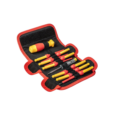 • NEO set of screwdriver bits includes 12 pieces certified for use on live parts up to 1000 V. Thanks to use of S2 alloy steel, the hardness of driver bits is 60 HRC, which substantially improves life time and quality of work. The set features wide range of standard and special driver bits with 100 mm length. The set also includes voltage tester 1000 V. Screwdriver bits with holder, certified for 1000 V, S2 steel, 12 pieces, nylon pouch, voltage tester 3,0X190mm 212 V, replaceable bits sizes: Sl 2, 2.5, 3, 3.5, 4, 5.5, 6.5, PH0, PH1, PH2, bit length 100 mm, bits for service boxes, bit holder.