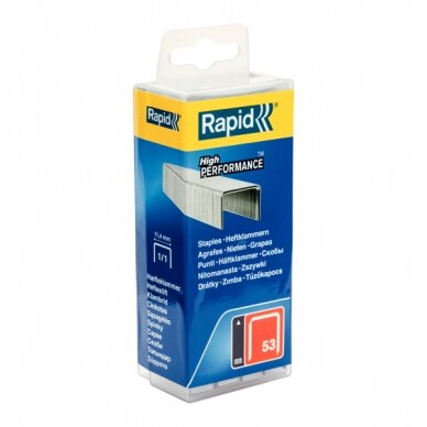 • Patogi plastikinė pakuotė. 53 tipo kabės skirtos furnitūrai, įvairioms mežiagoms, odai tvirtinti ir t.t. siauresnės kabės mažiau pastebimos ant gaminio. Kokybiškos „Rapid" kabės pasižymi tvirtumu, todėl visada nepriekaištingai įsikala net į kietą pagrindą. Gera danga saugo nuo korozijos.