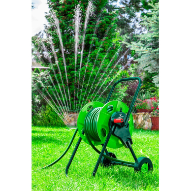 • VERTO hose reel trolley. This mobile trolley is made of durable plastic and is used for convenient watering, transport and storage of a garden hose. The trolley reel can hold approximately 45 m of 1/2" hose, 35 m of 5/8" hose, 15 m of 3/4" hose. Hose reel trolley, mobile, durable plastic