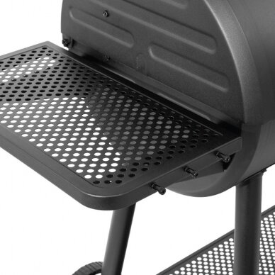 Kepsninės korpusas pagamintas iš tvirto plieno, kuris yra storesnis nei kitų panašių kepsninių.PatogumasJūsų patogumui yra šoninė lentynėlė, kuri veikia kaip rankena, kai norite kepsninę pervežti. Ant patogių lentynėlės kabliukų galėsite sukabinti savo mėgstamiausius griliaus įrankius. Priekinė lentynėlė pravers norint kažką pasidėti, kaip padažą glazūrai ar lėkštę maistui nukrauti.