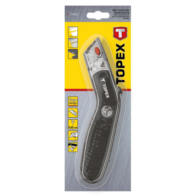 • TOPEX peilis su trapecine geležte,yra labai naudingas atliekant mechaninius darbus ir "pasidaryk pats" veiklą. Metalinis korpusas užtikrina ilgą įrankio tarnavimo laiką. Papildomas privalumas - labai lengvai keičiamos geležtės. Ergonomiška forma ir neslystantis laikiklio paminkštinimas užtikrina saugumą ir patogumą darbo metu. TOPEX prekės ženklas orientuotas į "pasidaryk pats" entuziastus. Trapecinis peilis, metalinis korpusas, lengvai keičiama geležtė