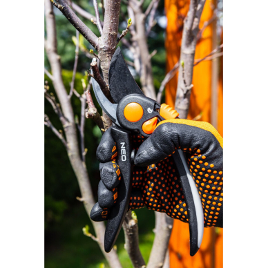 • By-Pass Secateurs 200 mm, range up to 18 mm, adjustable spacing 15-202 by NEO is a one-handed tool that features adjustable blade spacing for personalisation. The tool additionally has an ergonomic handle with soft and rubber parts and a safety lock, activated with a single button. The by-pass blade system increases precision during use. With this secateurs, you can cut delicate branches, shoots, bushes, flowers and herbs. It has a high quality hardened steel blade, suitable for fresh wood, which is also coated with a non-stick PTFE coating. Recommended for both professionals and gardening enthusiasts.