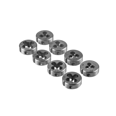Rinkinį sudaro::9 vienetai, štampai: M3x0,5, M4x0,7, M5x0,8, M6x1, M7x1, M8x1,25, M9x1,25, M10x1,5, M12x1,75