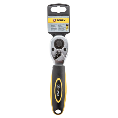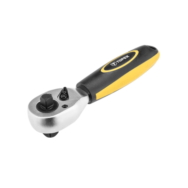 • TOPEX short ratchet handle (ref. no. 38D543), length 175 mm, features two squares sized 1/2” and 3/8”. It is made of high quality chromium vanadium steel that guarantees long lifetime of the product. 72 teeth ratchet mechanism allows precise operation. Ergonomic plastic handle is coated with anti slip material and provides safety and comfort when working. Manufacture process compliant with DIN 3122 guarantees product reliability. TOPEX brand is oriented towards DIY enthusiasts. Short double sided ratchet handle 1/2 x 3/8, 175 mm, CrV steel, ratchet mechanism 72 teeth, direction selector switch, two material handle, DIN 3122